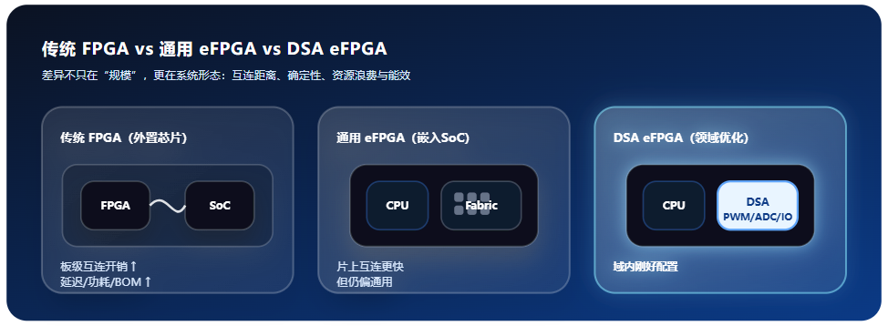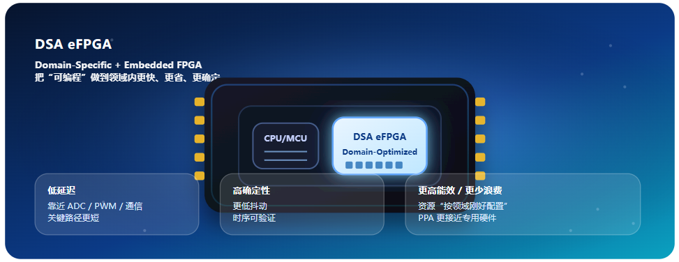 如果说传统FPGA解决的是“通用可编程”,通用eFPGA解决的是“把可编程带进SoC”,那么DSAeFPGA解决的就是:在目标领域内,把可编程做得更高效、更确定、更像专用硬件,同时仍能随需求演进。这正是未来高集成、高实时、强差异化市场里最稀缺的能力组合。