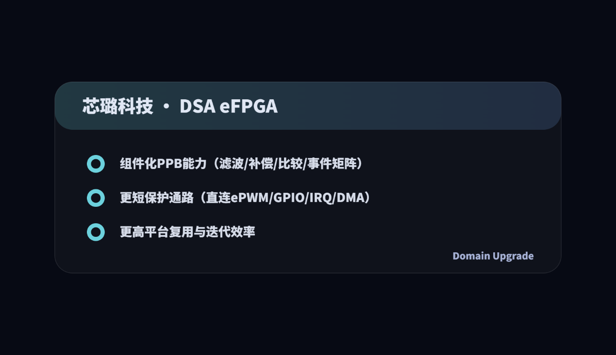 维度 | 固定 PPB(TI C2000 等) | DSA eFPGA(领域可编程) | 外挂通用 FPGA/CPLD |