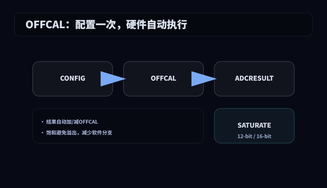 PPB 的价值之一是把常见后处理固化为“寄存器配置 + 硬件自动执行”。例如偏移校正场景: 将 PPB 配置到所需 SOC(采样触发),并把偏移校正值写入OFFCAL寄存器后,PPB会自动对原始结果加/减OFFCAL并写入结果寄存器。 在12 位/16位模式下,还会对结果进行饱和处理(分别限制到 0~4095 或 0~65535)。